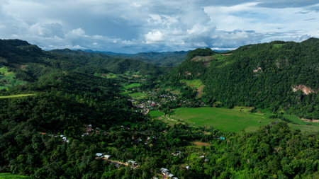 landscape view at morning mist at Ban Ja Bo view point, Mae Hong Son Province Thailand, aerial drone point of view.