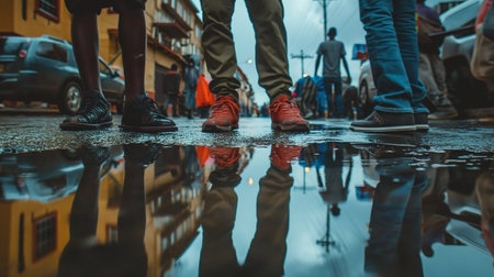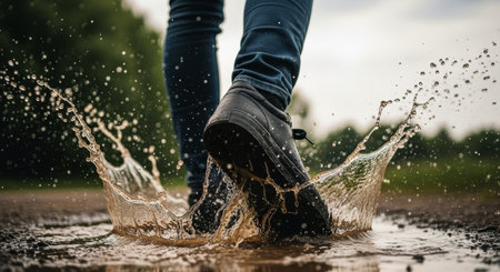 Feet in dark shoes stepping into a large puddle, creating a dynamic water splash with droplets flying in the air. outdoor activity on a wet day.