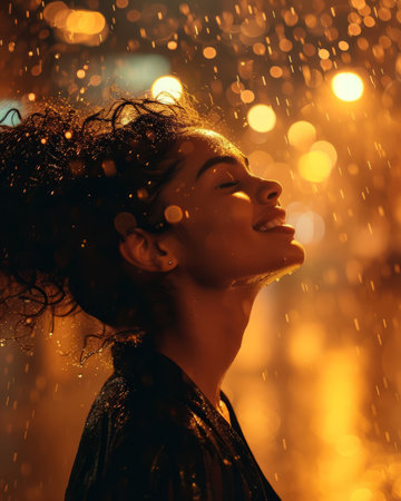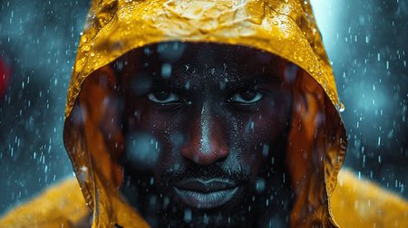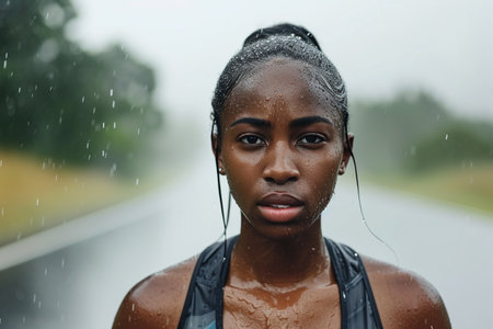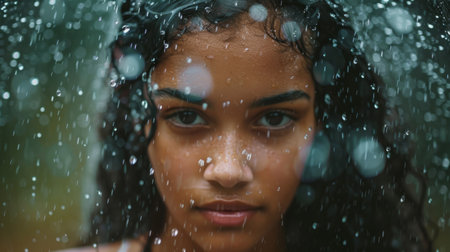 Close up portrait of a young african american woman under rain with AI generated.