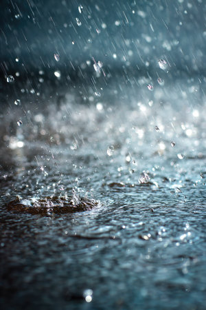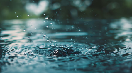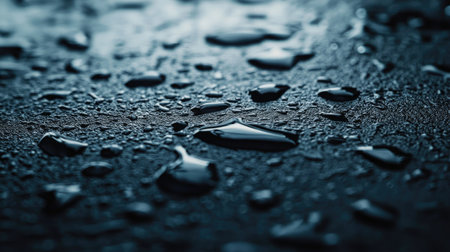 This image presents a close-up view of raindrops falling onto a surface. The composition highlights the water droplets, creating a sense of movement and texture. The cool color palette and blurred background suggest a wet environment. Suitable for editorial purposes.