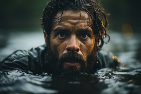 A man is in the water, looking at the camera. He is wearing a black shirt and he is in a state of shock