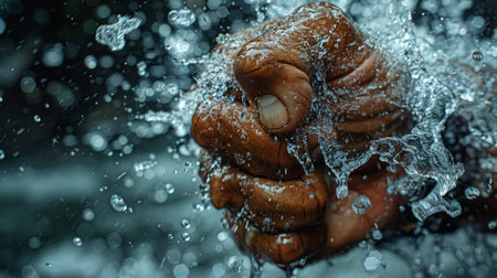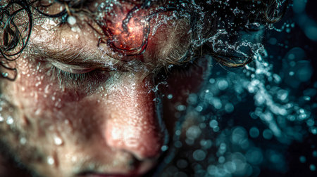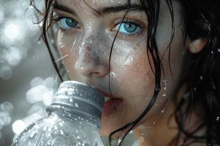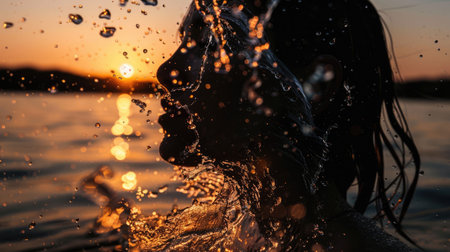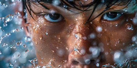 A vibrant portrait capturing shimmering droplets on damp skin, kinetic water spray, and tousled hair conveying freshness and dynamic energy.