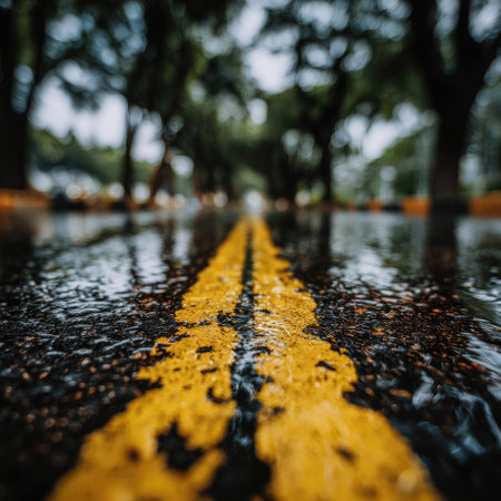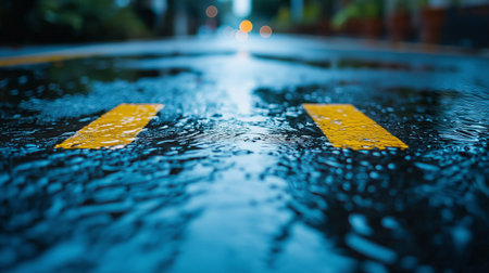 An overhead perspective reveals a wet road marked with vibrant yellow lines. The scene captures the reflection of light on the asphalt. The composition focuses on the road stretching between blurred trees, creating a sense of depth and perspective. Suitable for various commercial and editorial applications.