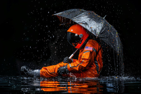 astronaut sits calmly in the rain, protected by a colorful umbrella, amidst a surreal lunar landscape.