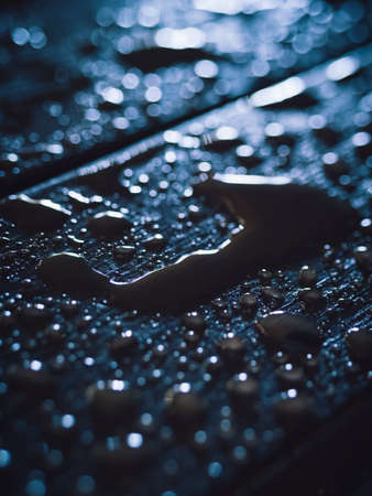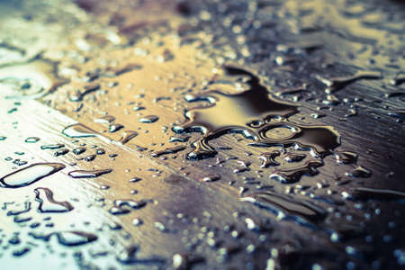 Raindrops on dark wooden table. Night time