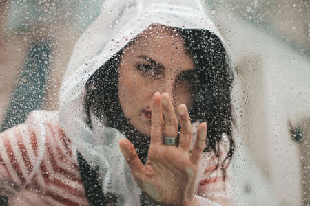 girl in the rain in a raincoat. Drops on glass.