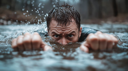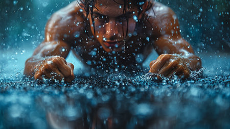 Muscular man swimming under the rain. Close-up portrait of a muscular male swimmer.