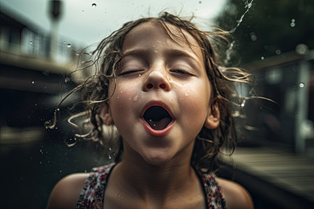 A little girl with her mouth open blowing water from her tongue while playing. Generative Ai
