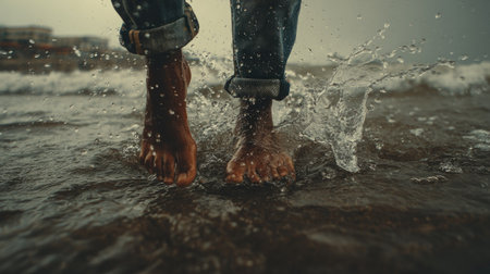 A vibrant close-up capturing a person walking through water, creating dynamic splashes under warm sunlight, evoking a sense of adventure and freedom.