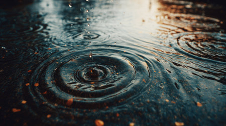 A close-up view of raindrops falling into a puddle, creating ripples. The soft focus background adds depth, while warm tones reflect the beauty of nature on a rainy day.