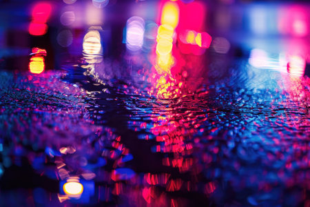 Multi-colored neon lights on a dark city street, reflection of neon light in puddles and water. Abstract night background, blurred bokeh light. Night view colorful