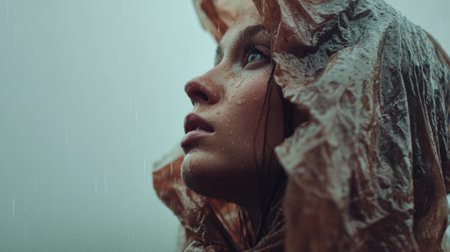 Young woman wearing makeshift raincoat looking up at rain