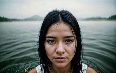 close up photo of woman submerged in water lake, generative AI