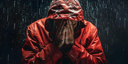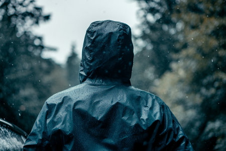 Man wearing a waterproof hooded jacket under heavy rain