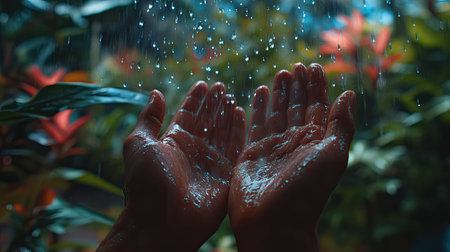 Rain splashes softly into cupped hands, with blurred garden colors in the background, and clear droplets forming in the palm
