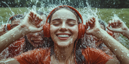 A joyful young woman wearing bright red headphones smiles as water splashes around her, capturing a moment of carefree happiness.