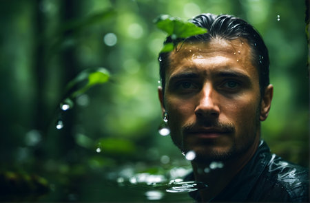 tourist immersed in water up to the neck This image embodies peace and unity with nature. A person immersed in water radiates confidence and harmony. The green area and the clear water create a harmonious contrast in the jungle