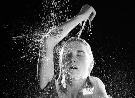 Wet woman under stream of water on black background