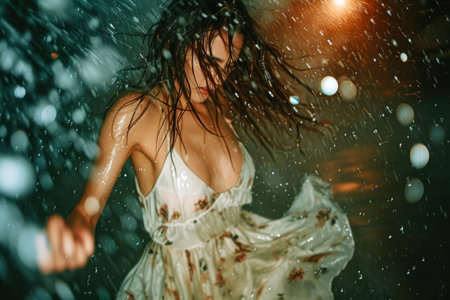 sensual lady is dancing under rain flows in darkness, waving long dark hair