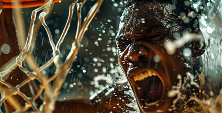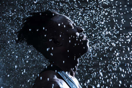 African man face under fresh raindrops at dark night