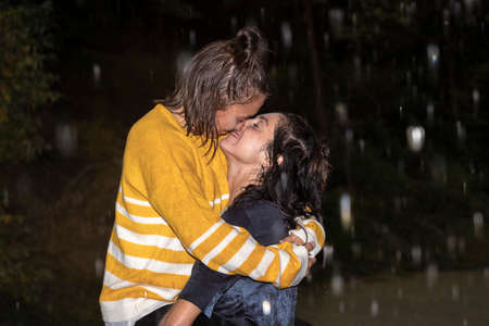 lesbian couple kissing hugging in the rain