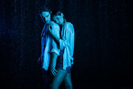 wet romantic couple gently hugging in water drops on black background with blue color filter