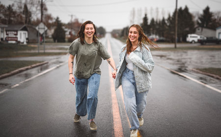 Young girls runing on the road in the rain