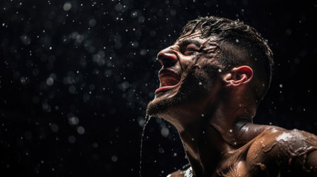 Sporty man screams from physical exertion, during a sports competition on a black background