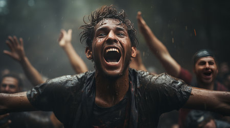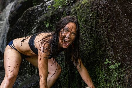Diverse people enjoy spiritual gathering A young and playful shamanic woman is seen closeup by a river, in lingerie with mud covered face and body, playfulness and freedom during nature retreat.