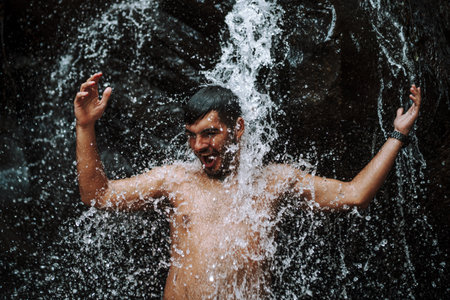 man refreshing his hands in stream of water of natural waterfall