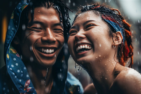 young lesbian couple hugging laughing and having fun in the rain