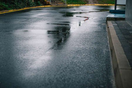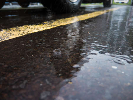 Wet asphalt road with yellow lines on a rainy day, close-up. Transportation and weather concept
