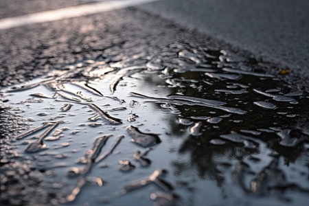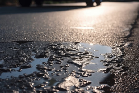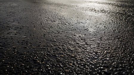 wet asphalt after a hard rain, with droplets of water glistening in the sunlight, created with generative ai