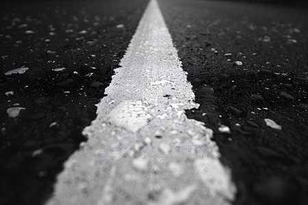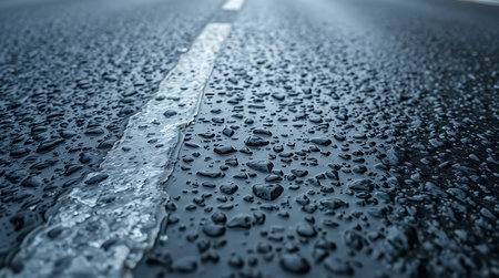 Wet asphalt road with white center line, showcasing glistening raindrops and pebbles. the close-up perspective emphasizes the texture and surface details of the road, creating a dramatic and atmospheric scene suitable for travel-related themes. Generative AI