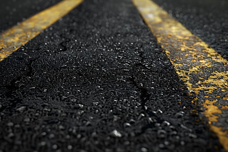 Detailed view of a wet city street, focusing on the texture of the asphalt and yellow lines, marked by water droplets.
