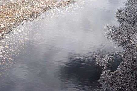 very dirty puddle with different leaves in town