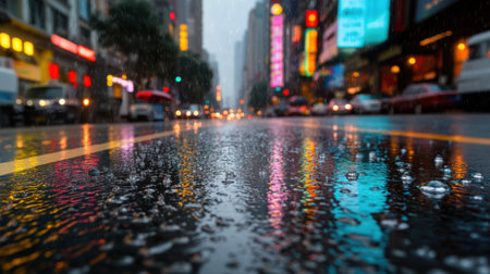 background of raindrops on asphalt with beautiful reflection of urban lights at night. generatrive ai