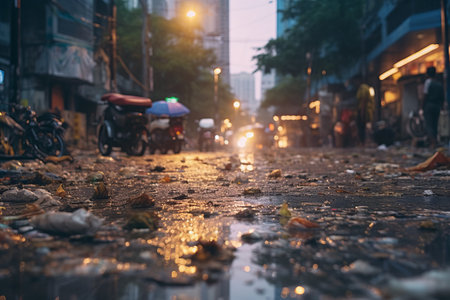 An attention-grabbing photo of a litter-filled street in a polluted city, emphasizing the importance of proper waste management and reducing plastic consumption. Generative Ai