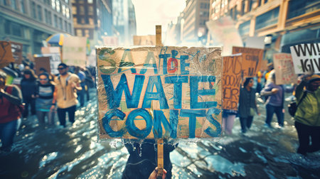 A montage of protest signs, each with a powerful message about water conservation, carried by a crowd of passionate people. Capture the energy of water activism.