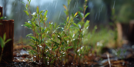 Young green plant growing soil with gentle rain falling, natural outdoor environment with fresh vibrant leaves and soft light