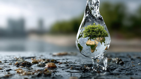 This captivating image illustrates a droplet of water containing a vibrant tree and a world map, symbolizing nature's beauty and environmental preservation. The reflection captures the essence of ecological balance, inviting viewers to appreciate the planet