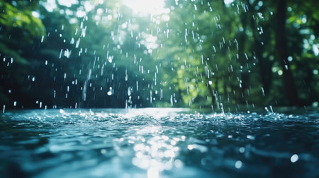Beautiful raindrops create ripples on a calm water surface amidst a lush green forest, capturing the essence of tranquility and nature's beauty.