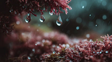 Vibrant alien flora thriving in a rare rainstorm on the surface of Mars with water droplets on the strange and otherworldly plants