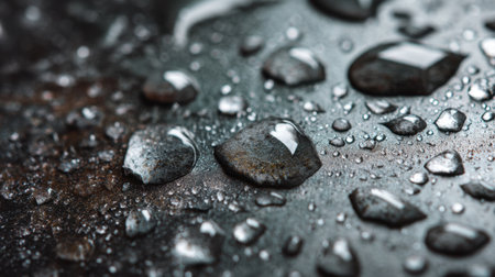 This image captures the intricate details of water droplets resting on a dark surface, showcasing reflections and natural texture, ideal for artistic or abstract projects.