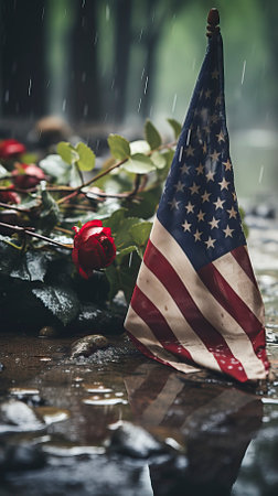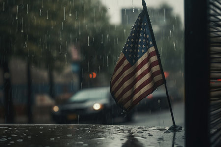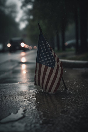 American national flag on the street with rain, Memorial Day, Independence day Celebrating, AI Generative.