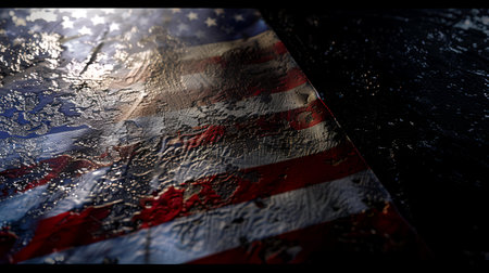 american flag on rusty abandoned metal floor in the dark.