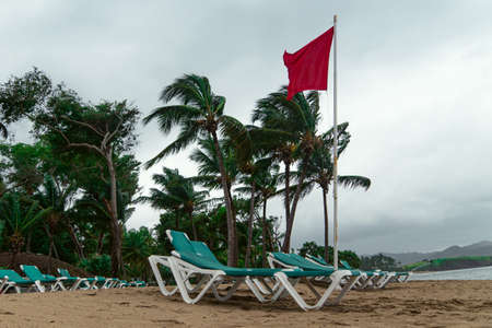 storm on the shore in the Dominican Republic with a red flag and palm trees