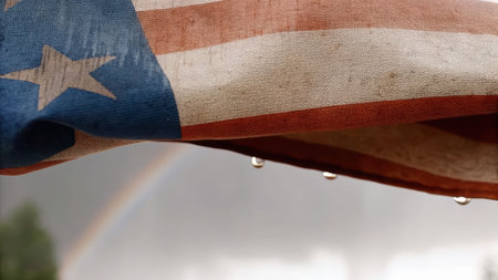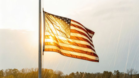 Flag waving under rainstorm at sunset capturing wet fabric illuminated by warm light and sparkling raindrops
