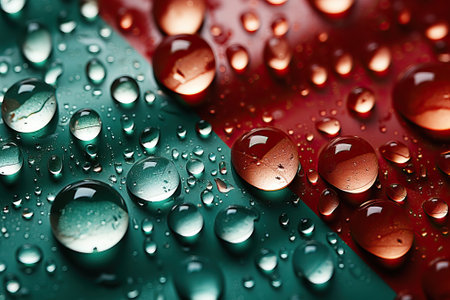 Close-up of transparent drops of liquid on a green-red background, texture of macro drops.