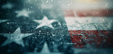Snow falls gently over a worn American flag, reflecting the soft light of dusk, evoking a sense of patriotism and tranquility during winter.
